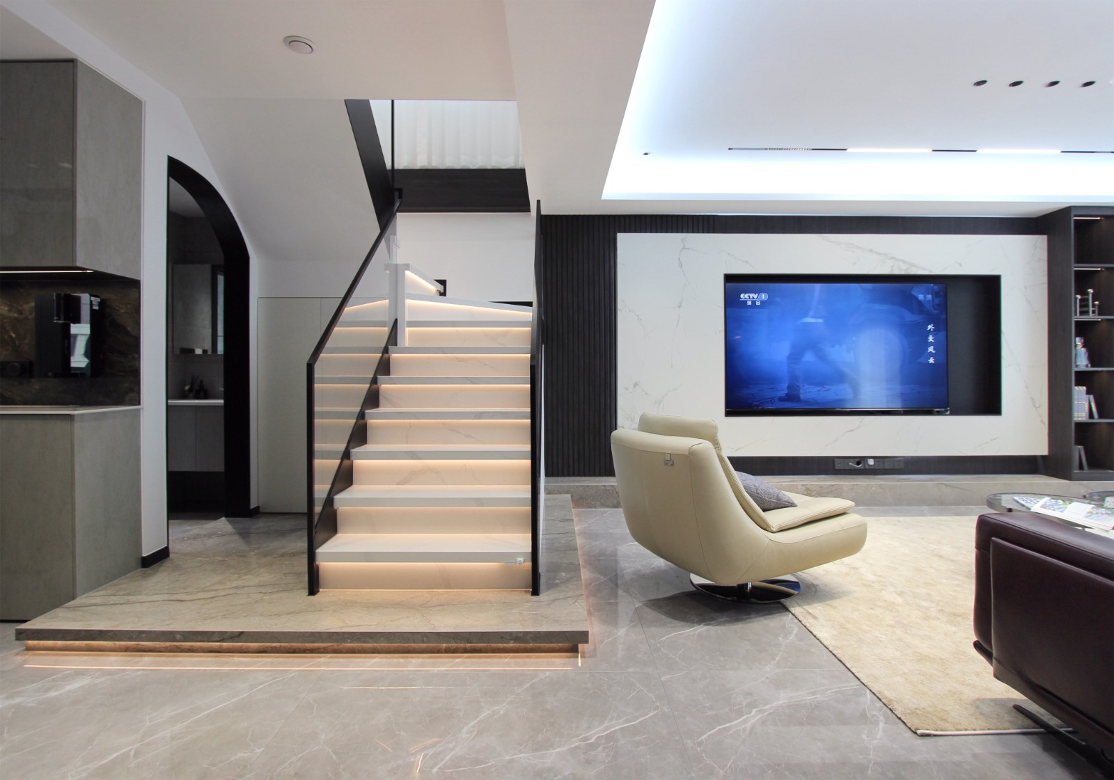 一侧放置浅色沙发椅,为客厅增加空间色彩。高雅质感的瓷砖材质让空间流露出精致和庄重的双层气质,目光所至,细节中感受倾心之美。