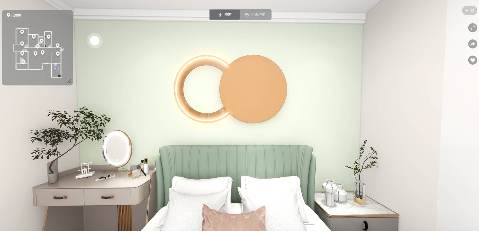 卧室里的贝壳绿 更显现了简约美,轻奢美,不拘一格的颜色搭配,是年轻人的权利与喜好