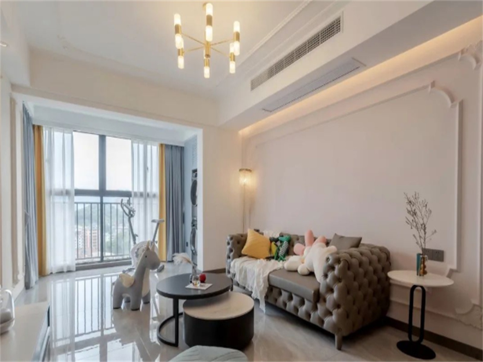 客厅纳入阳台,增进使用面积与采光,深色造型皮沙发搭配高低错落的茶几,一旁的小天马坐凳趣萌可爱