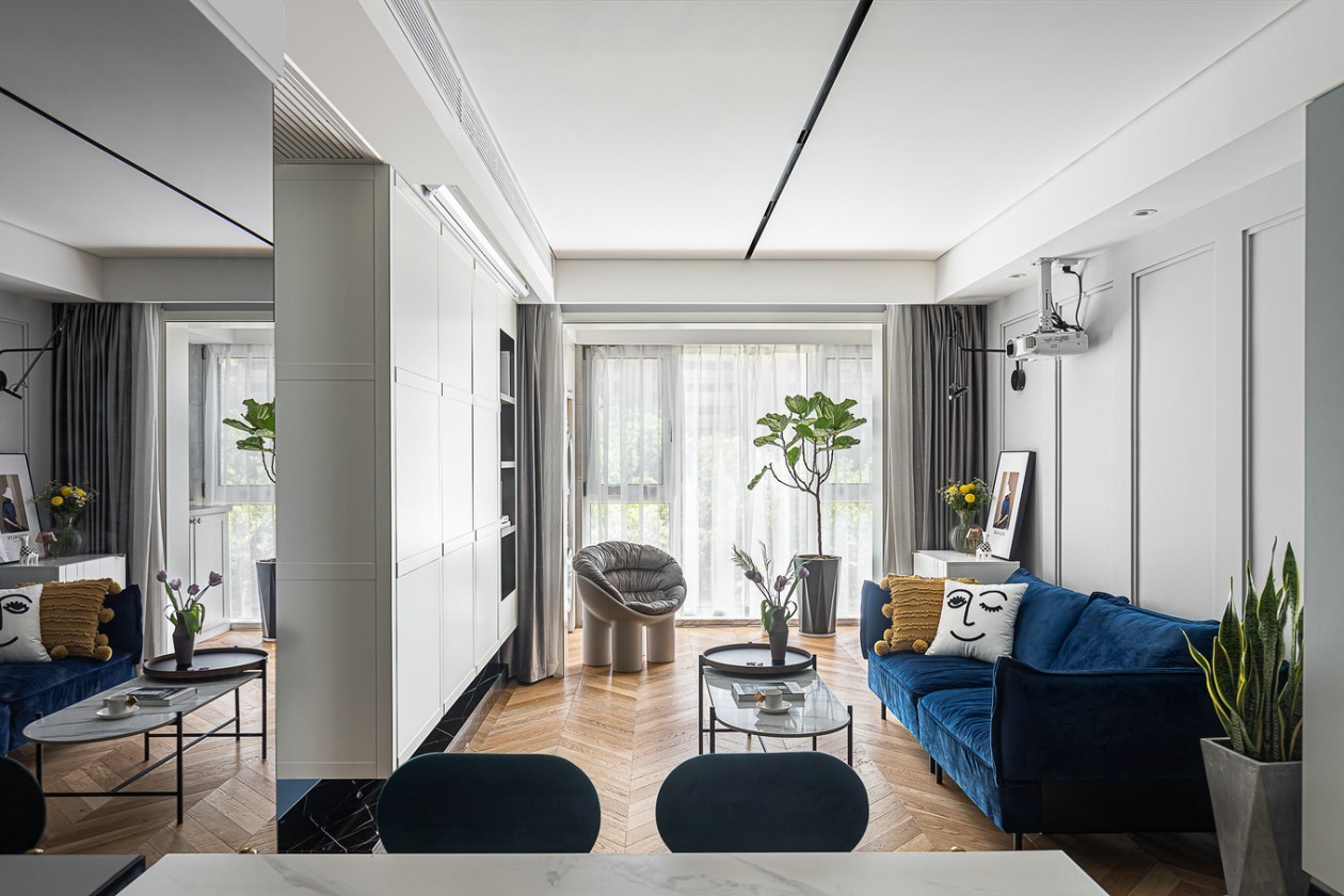 客厅与阳台连通,浅色系墙面与鱼骨地板,空间通透儒雅