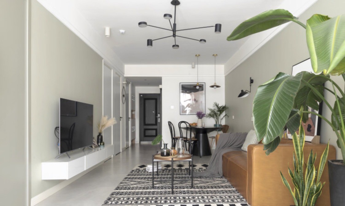 浅绿色乳胶漆+橘色沙发+哑光灰色瓷砖地面。地毯选择黑白几何图形,北欧风味十足。