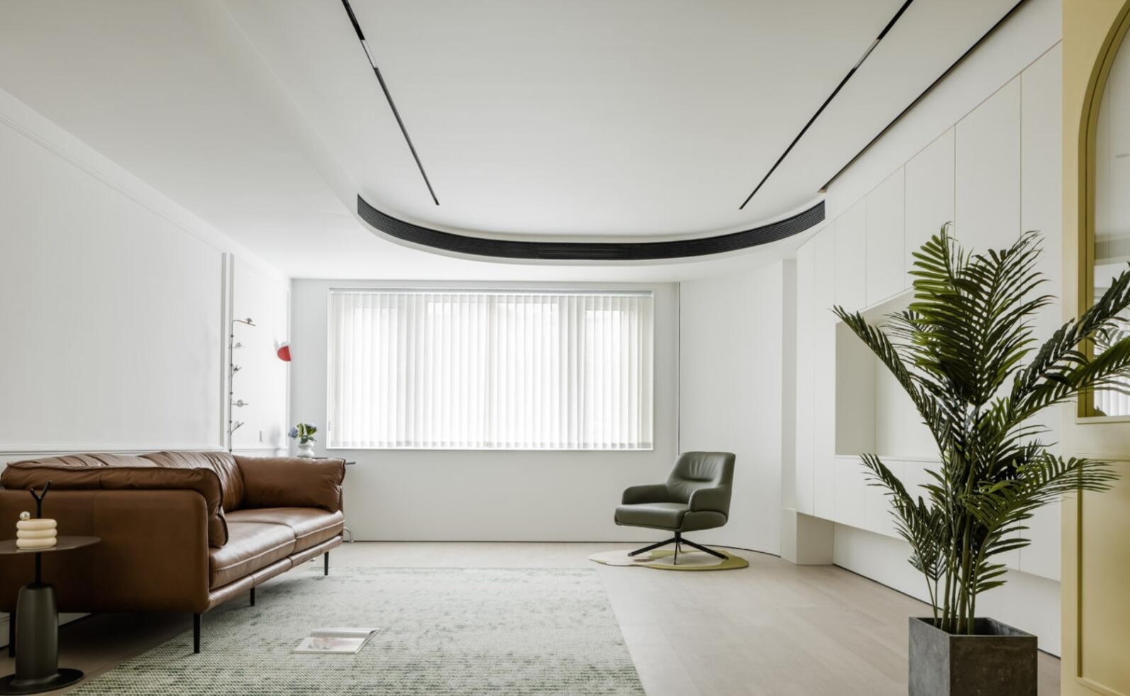 来到客厅,因为空间是异形结构,为了弱化视觉上的突兀感,除了墙面大面积的留白处理外,天花还采用了弧形设计。 同时,家具的内敛布置也在一定程度上降低了空间的复杂性。 比如,擦拭茶几后,立刻呈现出空旷的感觉。