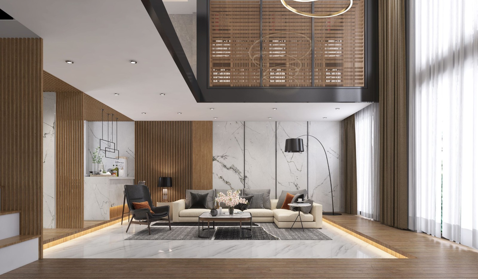 装修空间应是开敞、内外通透的。在材料之间的交接上进行特殊的处理方法及精细的施工工艺,呈现一种传统与时尚相结合的先进高科技的室内空间氛围。