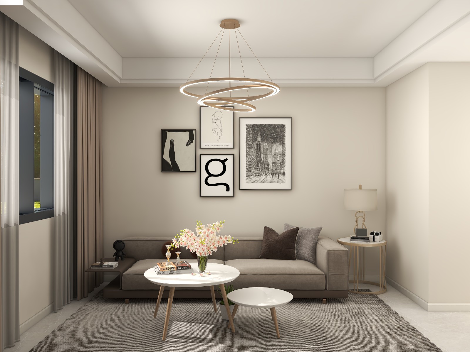 奶咖色的背景配上装饰画,平淡中增添一抹生动。