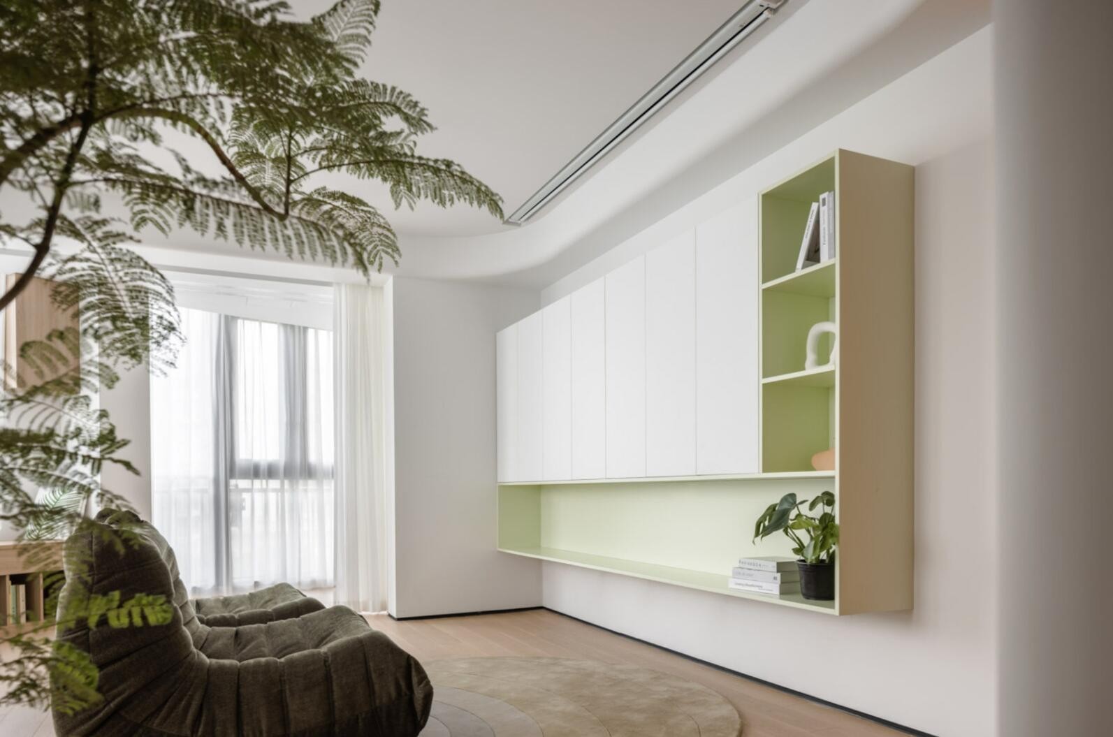 在布局上,客厅虽然坚持传统设计,但功能却完全不合常理。 比如电视墙上的柜子,基本上都是用来存放儿童玩具和绘本的。