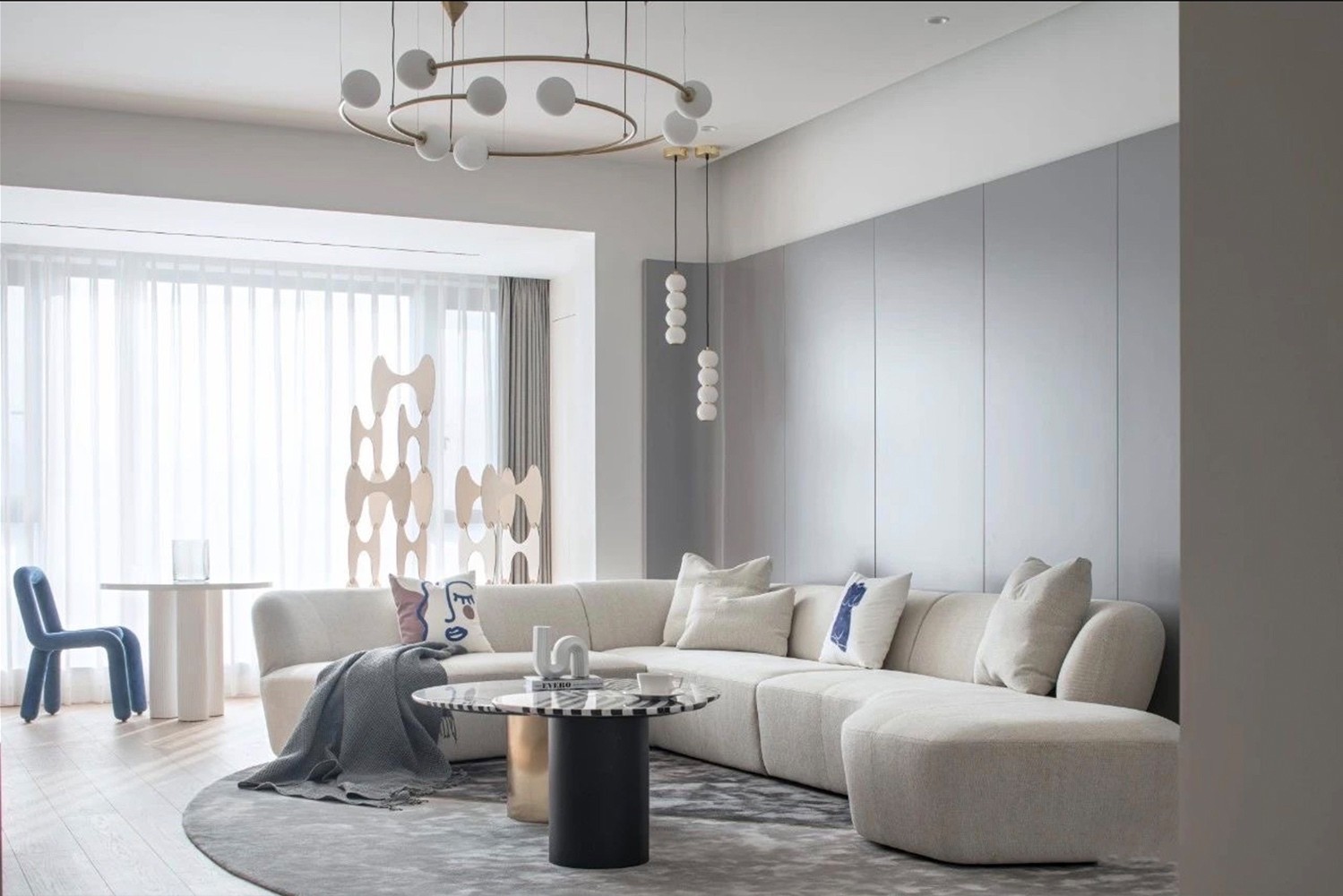 在黑白灰的基调上,加以红与蓝,这是属于居住者的独特气质。卧室空间,保持***的开阔性,将室外的绿植引入室内营造轻松的空间氛围,增加空间里人与人的互动性。从中感受生活中艺术的呈现