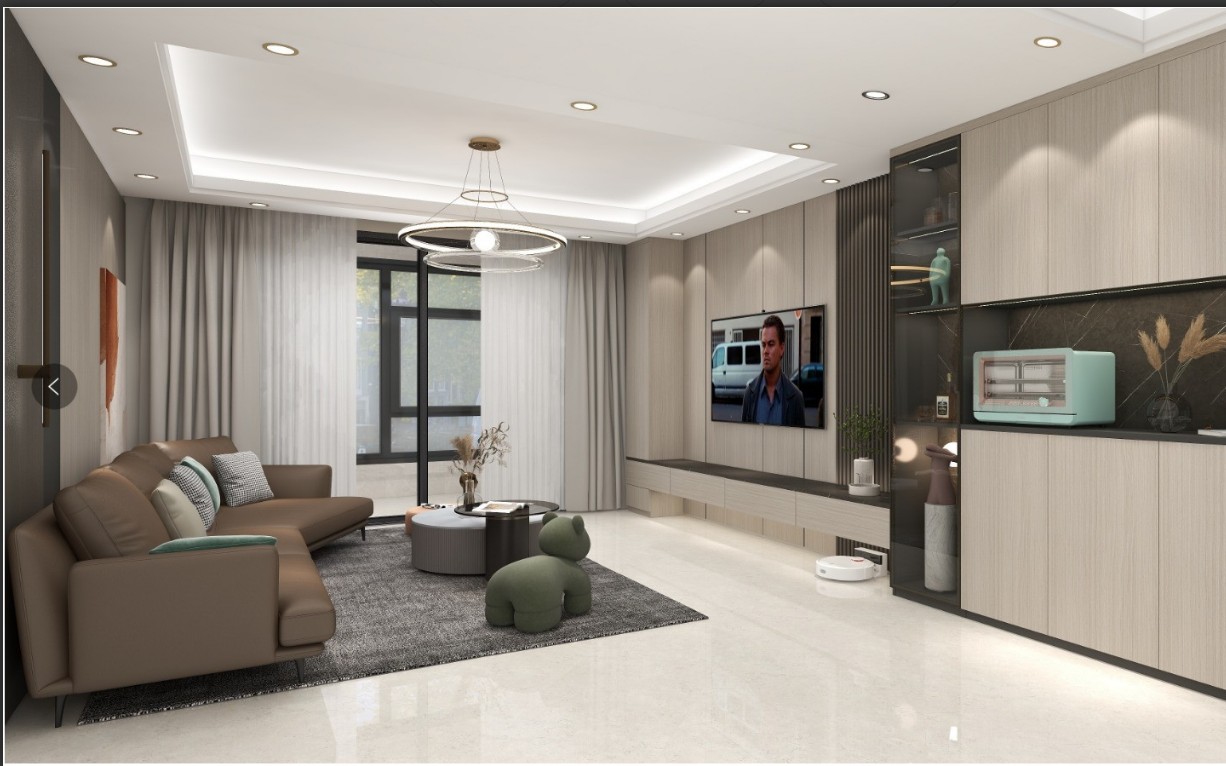 电视墙:高柜+一字抽屉柜设计层次分明,一字抽屉柜下部镂空方便机器扫地人打理 左侧实门高柜可收纳孩子的玩具,医药箱 不显乱。