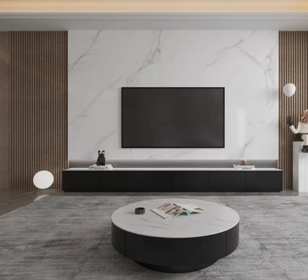 客厅电视背景墙采用长城板和岩板的高贵结合,黑白调的茶几电视柜,简单而有格调
