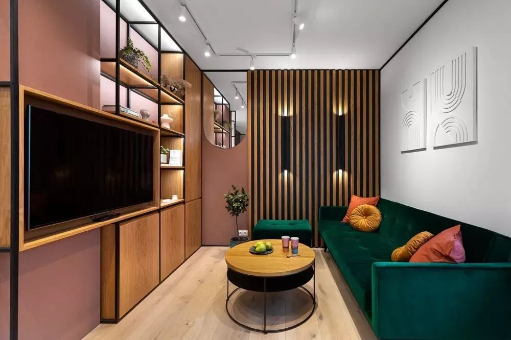 沙发侧面的背景墙上用了大量格栅装点,打开格栅上的灯具之后,氛围感直接被拉满。另外并没有整面墙都铺设木材,空余部分使用深橘粉色的乳胶漆渲染,与胡桃木色泽相近。在墙面顶部还悬挂了一个半椭圆形的小镜子,可以增加室内光线,还能让空间看起来更大一些。 吊顶以射灯作为主要照明工具,光线均匀,而且使用时还能改变投射方向与图案,营造氛围感。