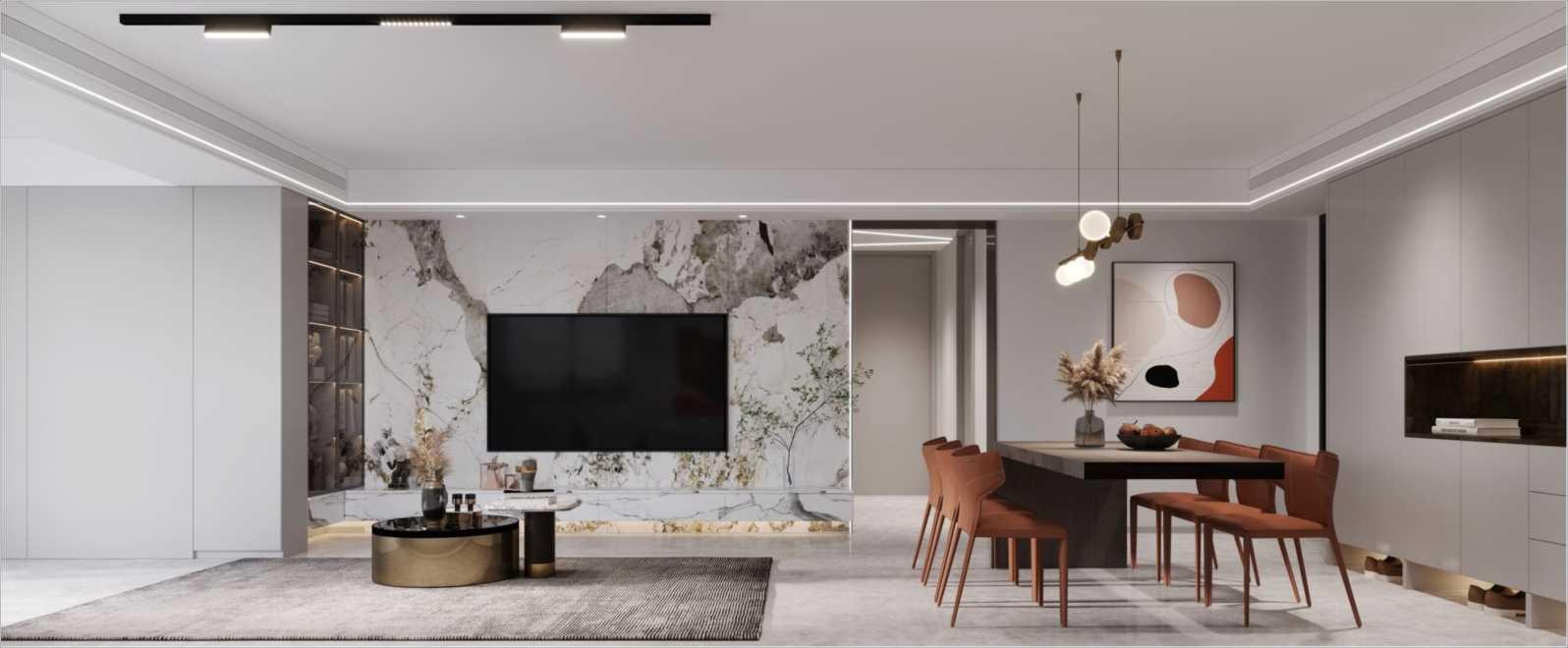 现代轻奢风格的客厅,搭配大理石材质电视背景墙,整个空间简约而又不失格调。