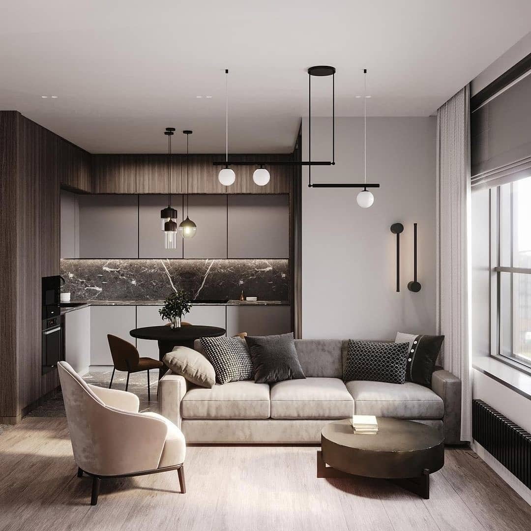 沙发靠窗摆放,通过时尚的灯具来营造氛围感。