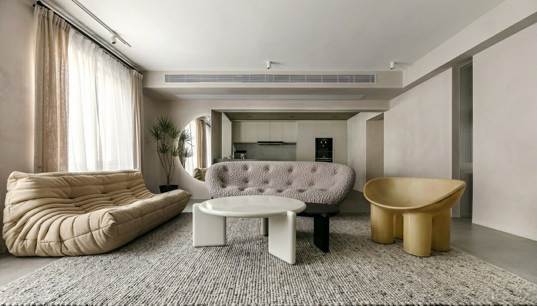 女业主喜欢圆形元素,希望家里能有一个自拍的地方。结合喜好与需求,设计师定做了半圆形带灯光的镜子,安装在客厅与阳台处的窄墙,充当穿衣镜的功能,同时也作为客厅的一处端景。