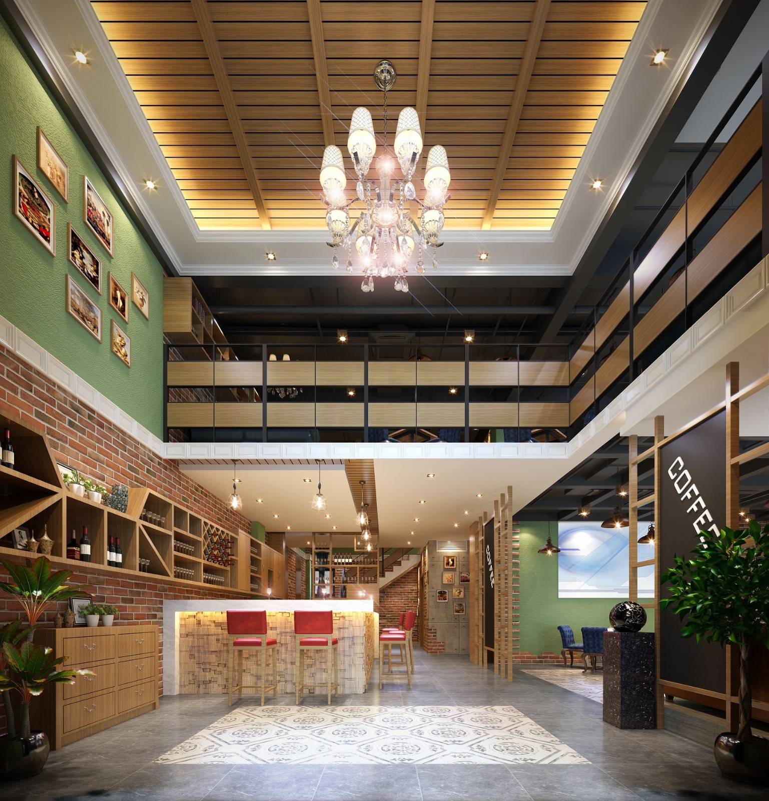 木质地板、金属吊灯、欧式沙发座椅、红砖墙等等形成独特的北欧田园风