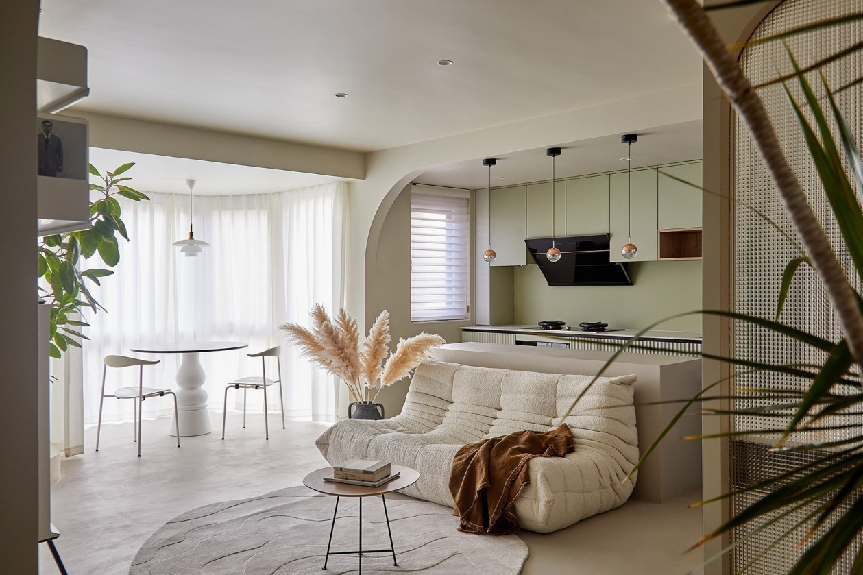 客厅和入户之前用储物隔断进行分隔,弧形的轻奢感玻璃柜板更显得精致。