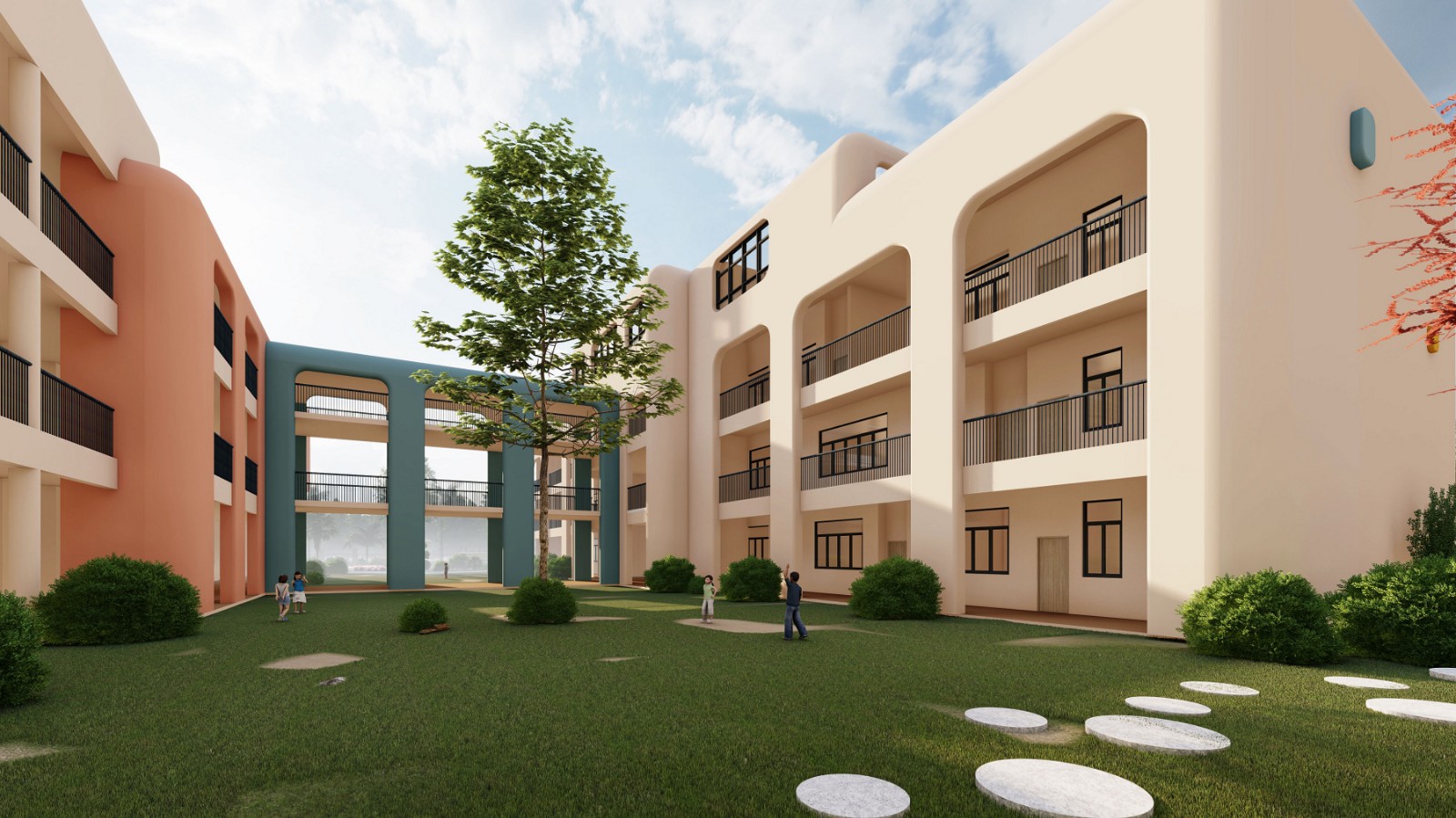 大面积的绿化有利于孩子们的身心健康,柔和的色彩外观保护者孩子们的心里