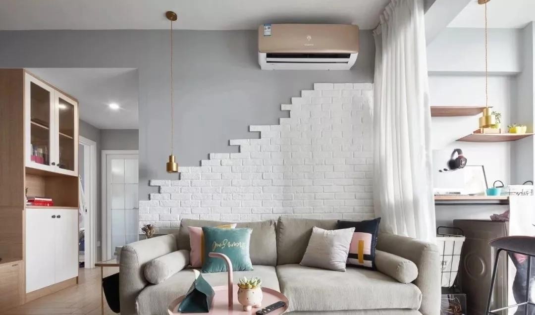 沙发背景墙是用文化砖来做了造型,灰白相间的墙面点缀一个金属吊灯,通往卧室、卫生间的走廊上也被利用起来做了柜子。