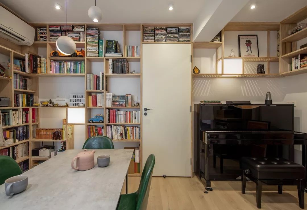 书柜与厨房连成整体,白色与原木书柜的搭配,营造出安静温馨的居室氛围。
