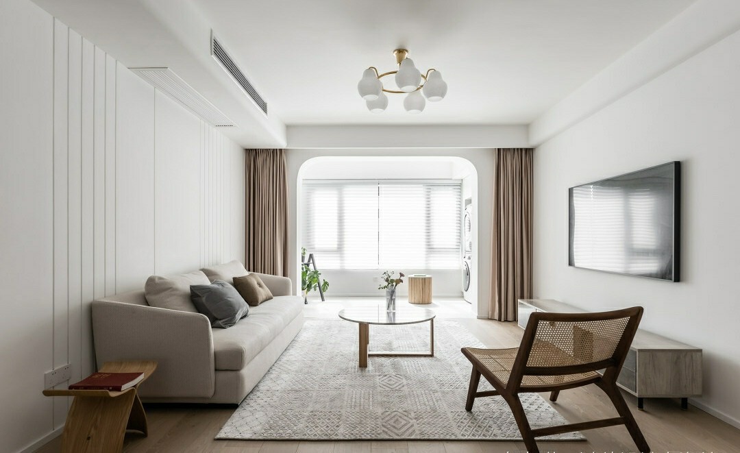 阳台打通采光,同样做了圆弧角造型,设计师更多是想通过硬装造型,让这个家温暖一些,直角设计可能会冰冷些。这个家全屋都做了“香格里拉帘”,不需要做窗帘盒,价格实惠,最重要的是白天透光性特别好,非常简洁