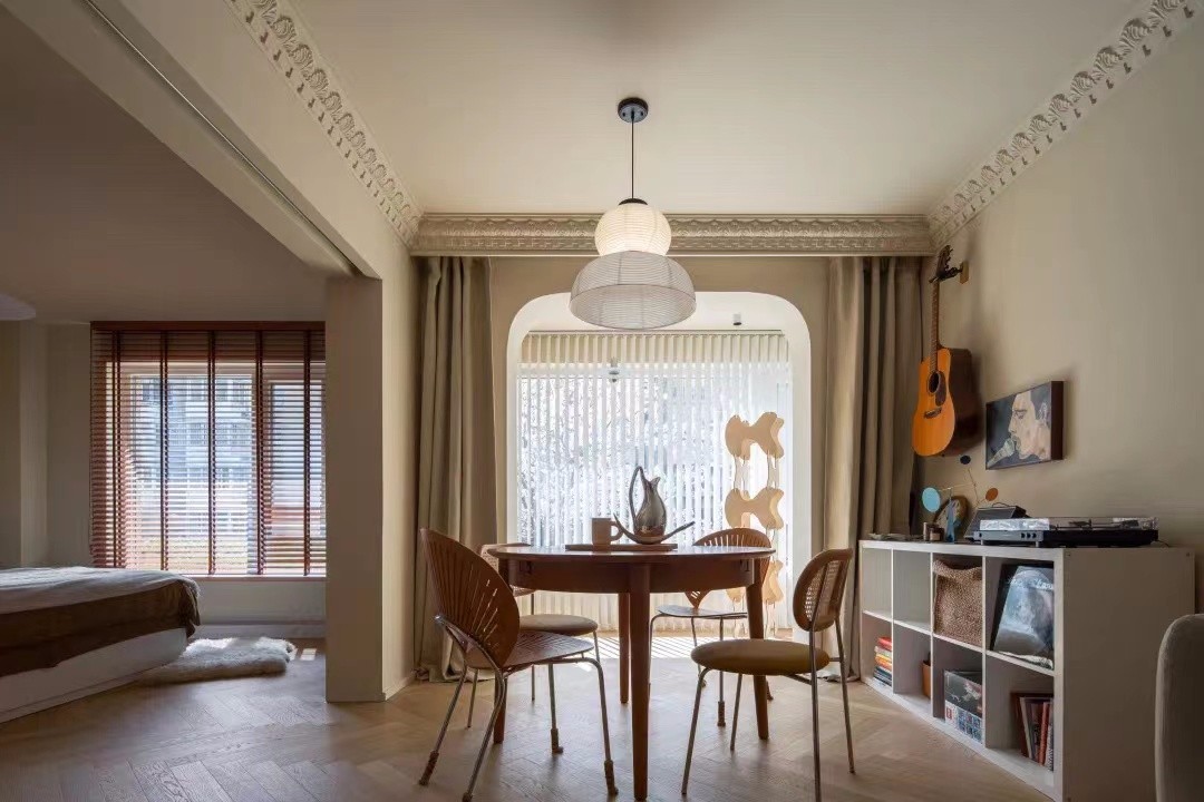 如今这里是开放的客餐厅区域, 整体延续温暖奶咖色基调, 仿佛散发着甜蜜奶香,更显慵懒随性, 顶部细节处的法式石膏线条, 则更突显一份小小的优雅精致。