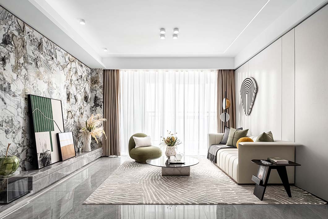 树梢绿与极简灰演绎出轻奢优雅的气质,飘逸的墨迹以现代艺术手法渲染出大理石温润如玉的质地,