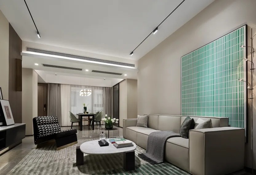 尺度阔绰从容,动线优雅流畅,惬意之感自客厅扑面而来。电视背景墙以木饰面和皮革做拼接,层次感十足,软装陈设亦强调功用,拒绝过多装饰,加以色彩、肌理的呼应,干练利落,也呈现出理性的轻奢调性和高雅的审美体验。