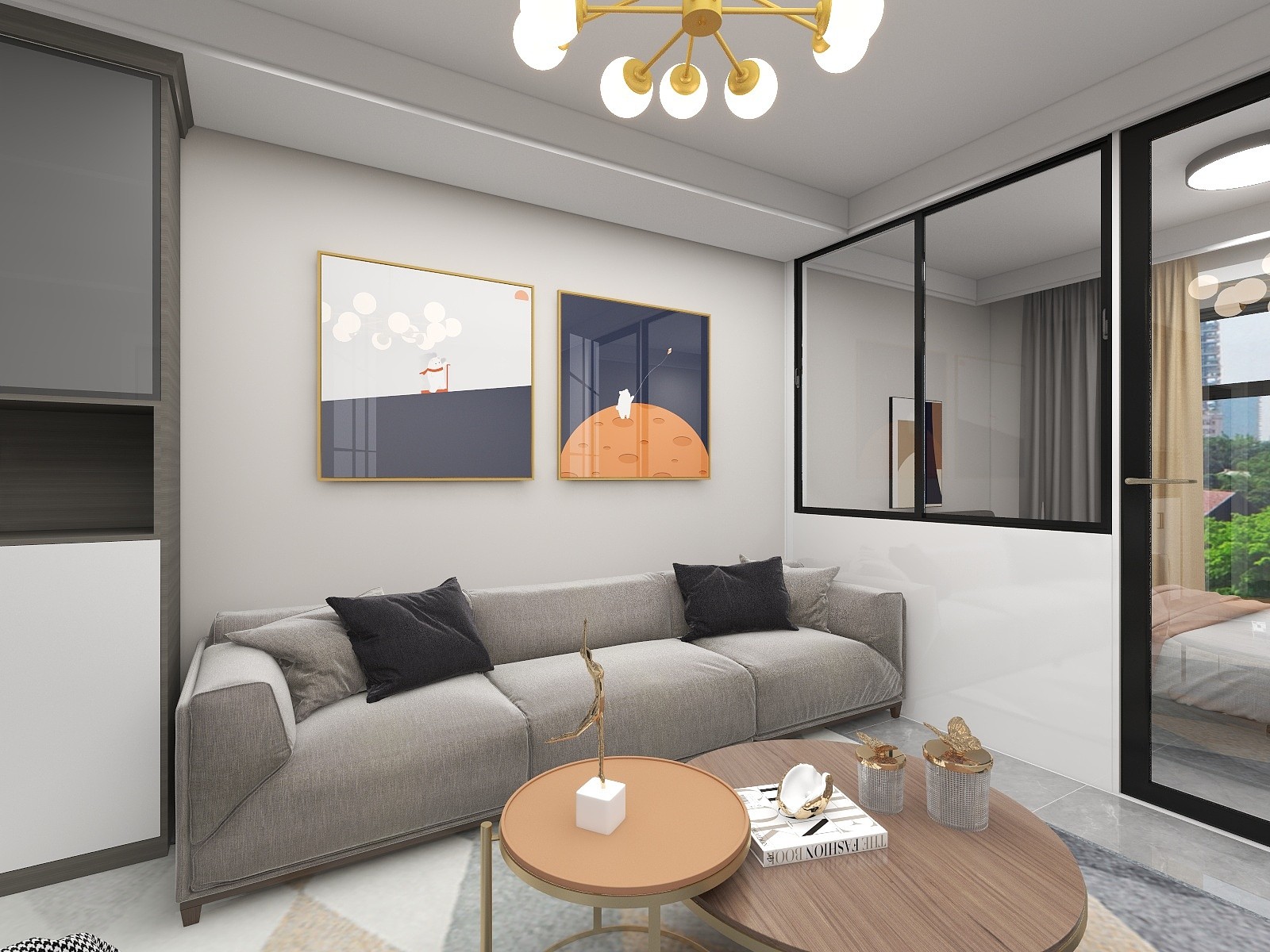 老人房是从客厅隔出来的为了保证,基础设施齐全的情况下也为了能让客厅和房间共同拥有阳光在隔墙上开了窗