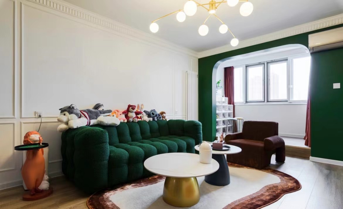 客厅与阳台的连接做了一个圆润的弧形,柔美的过度了空间,以一种奇特的方法带来新奇的感觉,增加了视觉的体验。沙发的面料是绒质的,与毛绒玩具很配。在整个家具的设计方面,完全不使用雕花的家具,简洁,直接,功能化贴近自然。