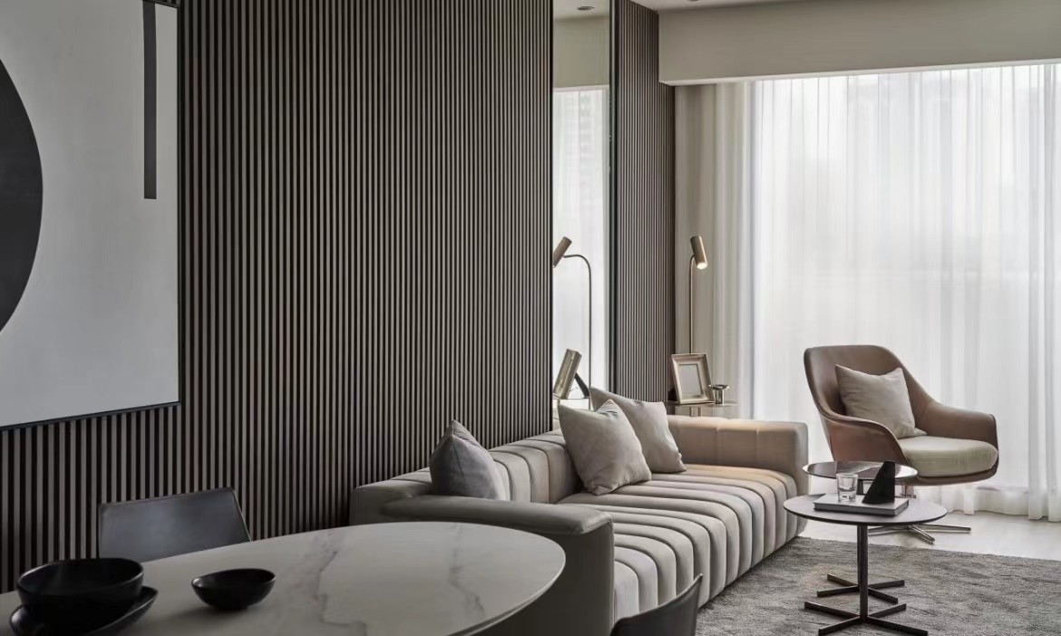 客厅和餐厅一线相连,改变客厅进深过短的问题,将阳台纳入客厅区域,超大的落地窗,保证空间的通透感。考虑到隐私性,采用双重窗帘的设计,纱帘既能避免采光的进入,也能保证问的私密感。