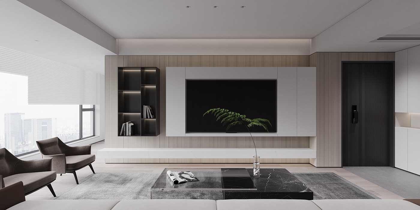 电视背景墙采用白色烤漆板,搭配原木色饰面,墙面做了少量格子用于摆放屋主的手办和藏品。更显屋主的品质生活。