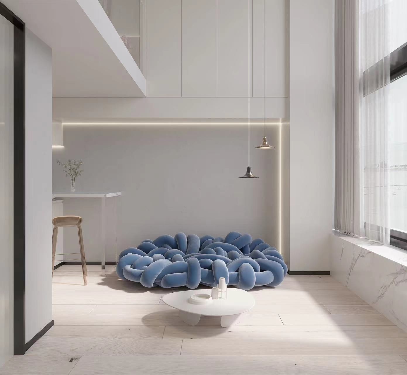 室内高挑起居室,蟒蛇沙发显现色彩差异,展现房主个性。