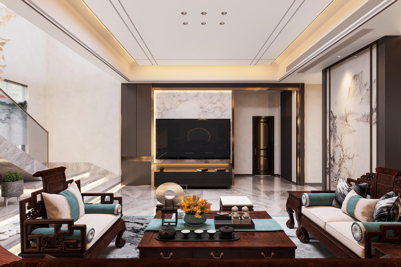 这是一栋自建独栋别墅的中式风格装修案例,富有质感的硬装基础,搭配雅致精致的禅意中式元素,呈现出古典诗意的高贵优雅