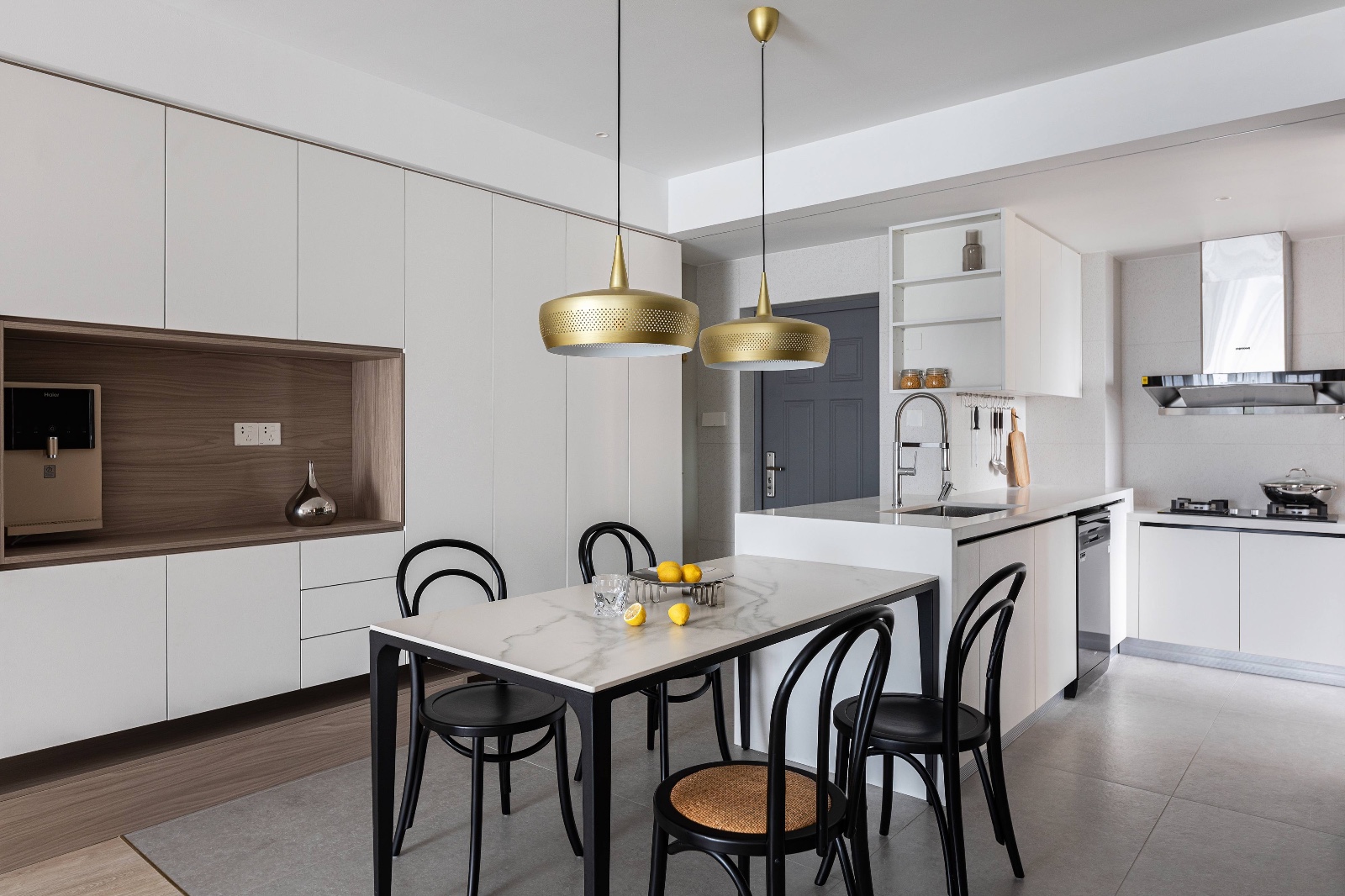 餐厅与厨房连为一体,餐桌为岩板与橱柜连为一体,有一个延伸感。