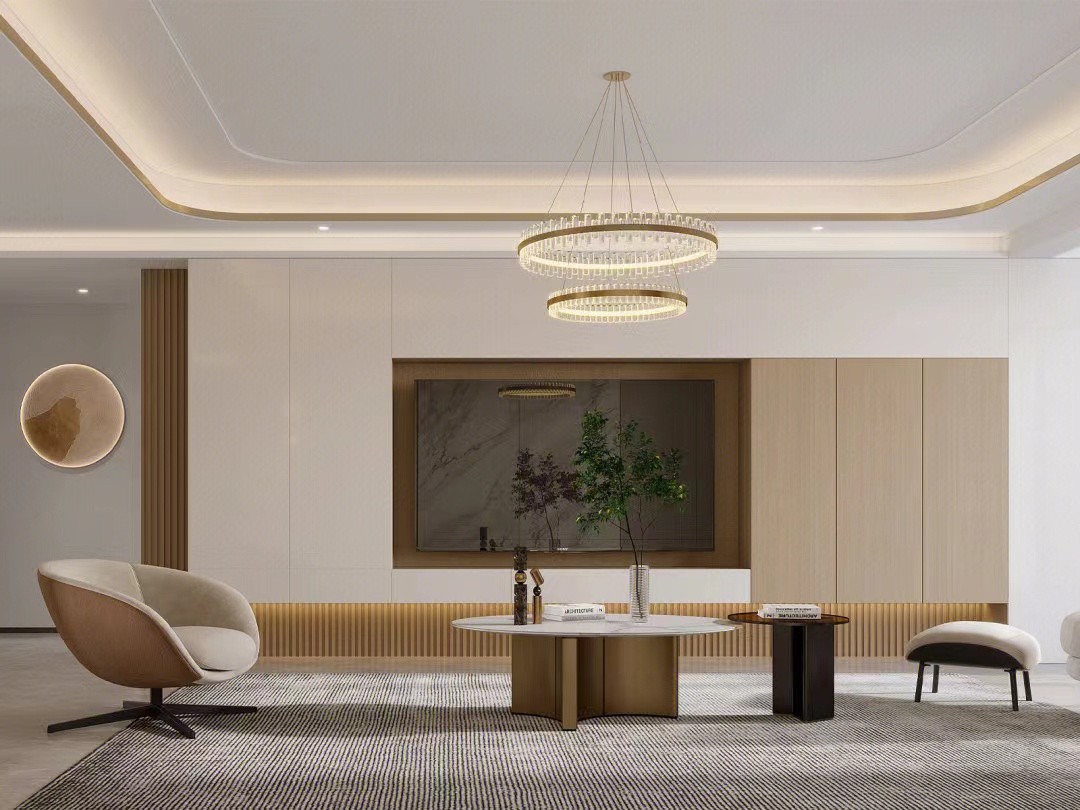 整体以暖色调为主,营造温馨舒适的家居空间;融入岩板,硬包,格栅等元素作为空间的点缀,主要以灯光的不同层次形式来丰富整个客厅空间的设计。