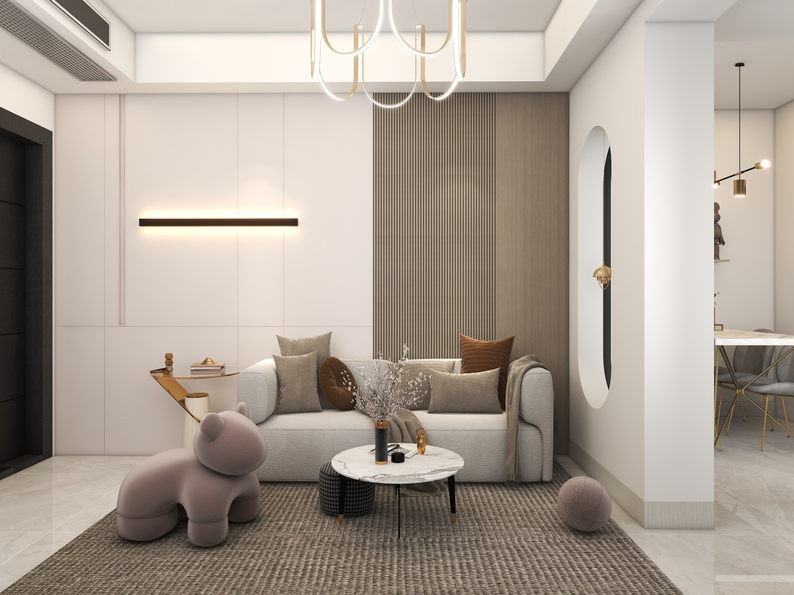 整体背景墙,增加空间氛围感,同色系软装家具加以点缀