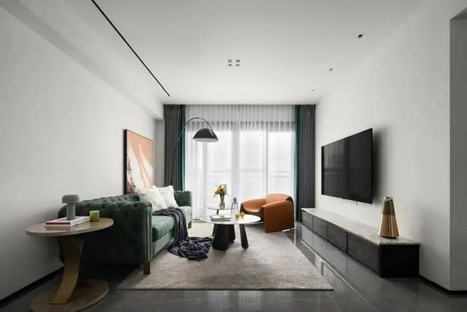 客厅整体灰色乳胶漆墙面+深色地砖,布置上墨绿色、橙色、黑色等深色鲜艳的软装家具,在吊平顶的无主灯天花下,呈现出一种时尚极简的设计感。