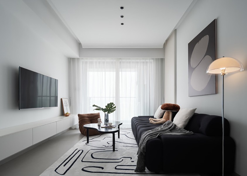 客厅以白色为主,纯净的白色给人带来一种清新自然的感觉。白墙、白色的收纳柜、灰白的地面、整体空间的黑白色调,体现出空间的极简美感。