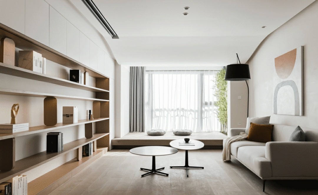 整面书架+暗藏柜+暗藏式幕布打造了干净明亮多功能的客厅空间。