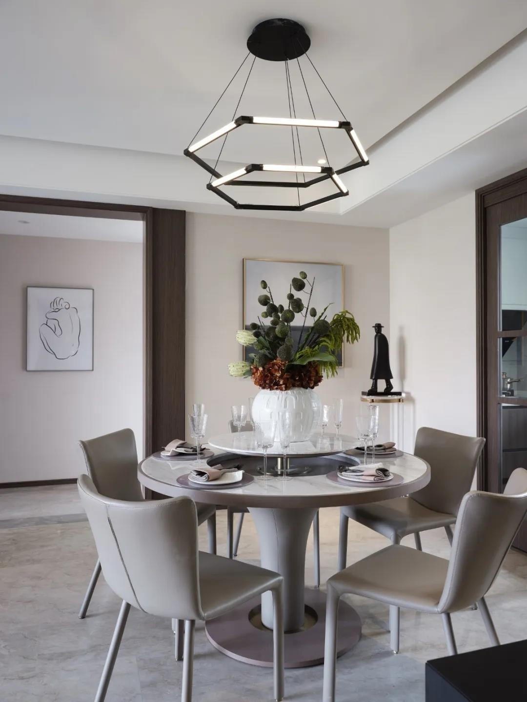 餐厅布置卡其色的餐桌椅,大理石与布艺结合的搭配,顶上一盏双重六边形的吊灯