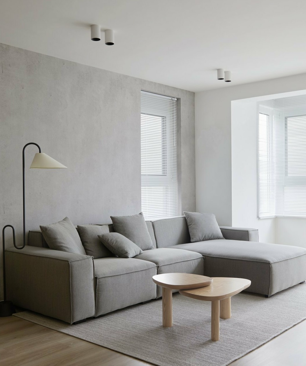 通过玄关进入客厅,整个色调干净且柔和,木质元素的加入会使居住者更加放松,忙碌回家,融入空间,即可卸下一身的疲惫。整个空间采用无主光源设计,灯光的加入会使空间柔和的氛围更佳,而有生命的绿植和具有线条感的落地灯赋予了整个空间更完美的气质