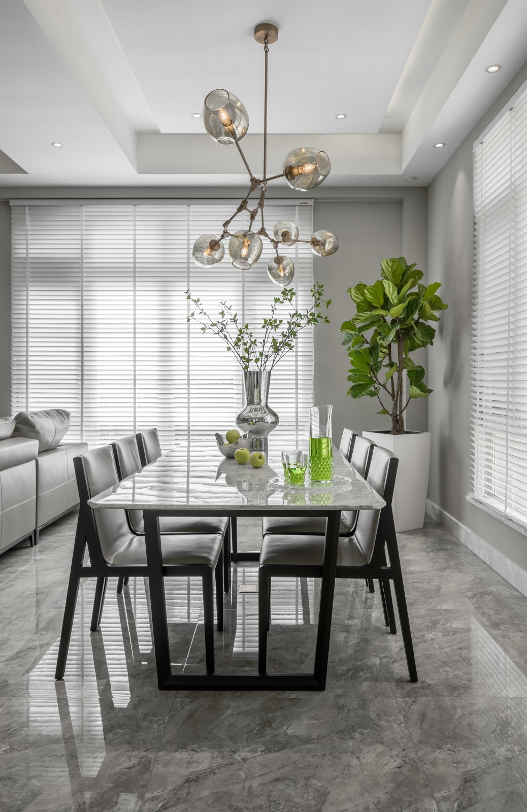 大理石餐桌搭配灰色皮质座椅,很有质感。绿植此时融入进来,给整个空间添加了一份生机。一切看起来井井有条的同时,不规则的灯饰出现让整个空间活泼起来。
