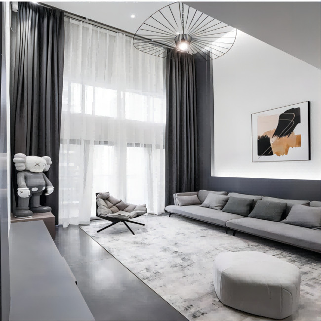 客厅是挑高的户型格局,顶上装一盏园扇形的吊灯,整个空间以灰色调的装修与家具布置,布置出一种灰的设计气质。灰色的布艺沙发,搭配灰色的窗帘,在灰色的空间下,充斥着现代简约的设计感。 窗边布置休闲沙发椅,客厅中间没有茶几,以地毯的布置也让居住体验更加轻松舒适。