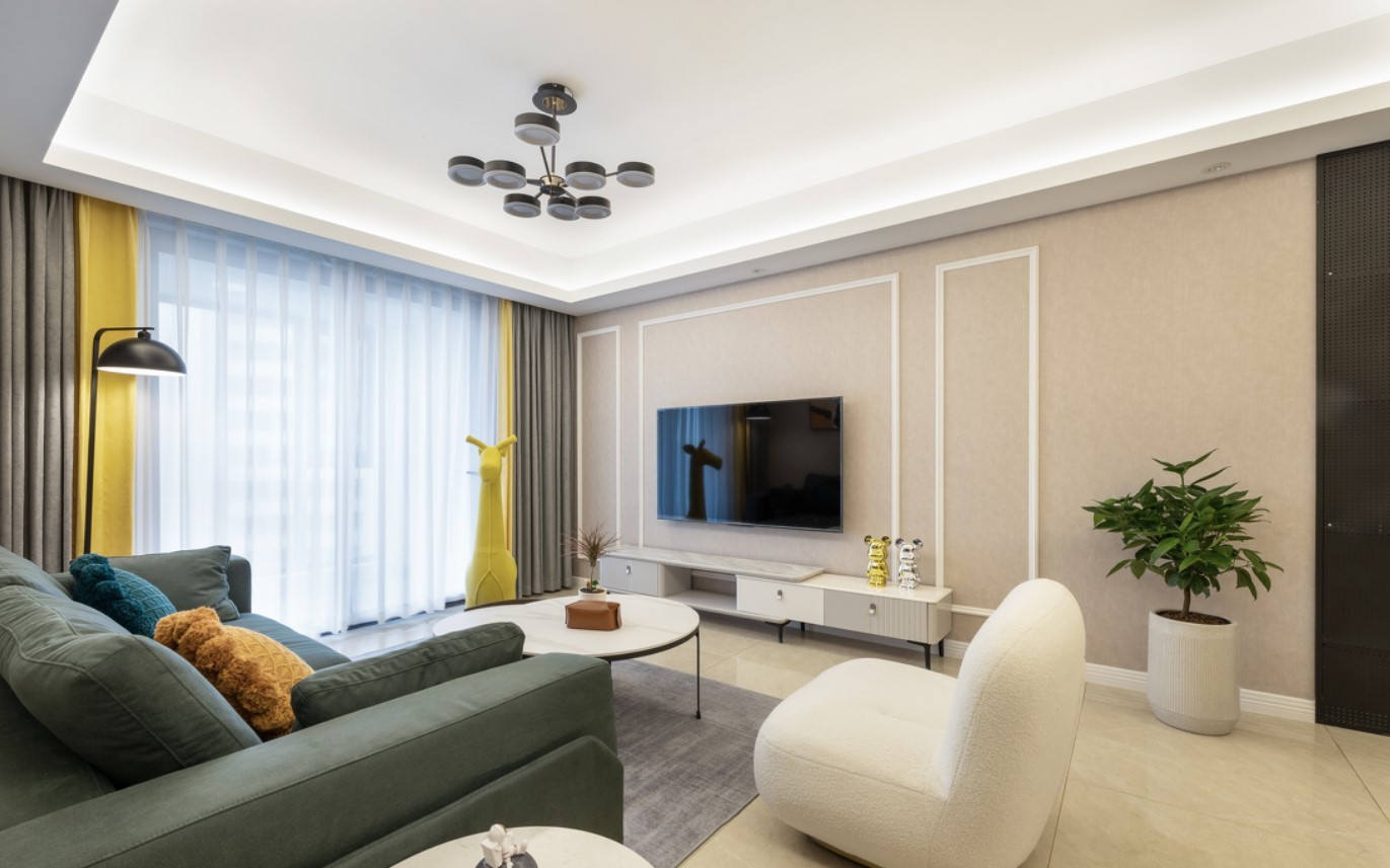 明黄色的小鹿玩偶,乳白色的布艺沙发,给沉稳内敛的空间氛围,在此有了突然的转折,切换到了“软萌”的频道,也生动演绎了“落在角落的浪漫,是藏不住的爱意”。