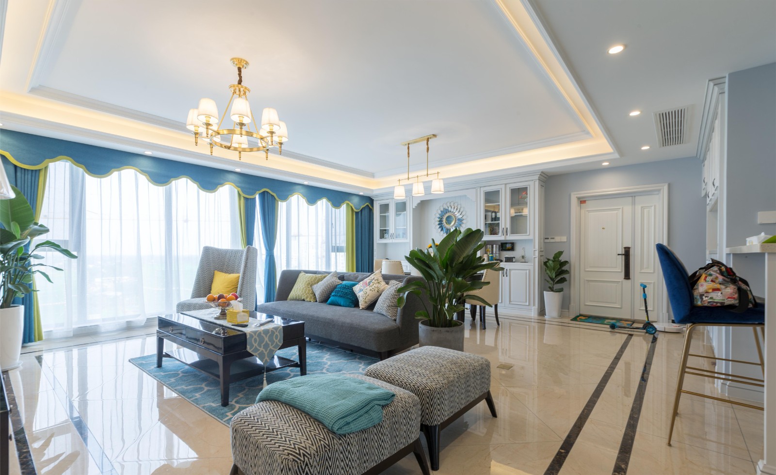 吊顶设计的其实不算复杂,中间平平整整没有任何线条修饰,只是做了长方形的包边,与地面波导线相互呼应,大气又通透。吊灯+灯带+筒灯的设计,令室内光线充足而均匀,明亮又舒适。 客厅与餐厅的吊灯虽然不是同款,可一眼能看出属于同一系列,温馨中带有一点点复古元素,也十分具有美式范儿。 虽然客餐厅是拉通的,但是这两个区域各自装了同款窗帘,再加上家具的款式偏向简约,所以也具有强烈的独立性。