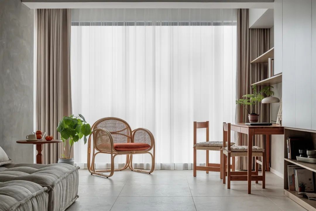 次卧一改卧室木地板的固定印象, 地砖通铺也更显纯粹,方便打扫卫生。 内部搭配色系柔和,简约而纯粹, 日光透过纱帘洒入就是最美的装饰