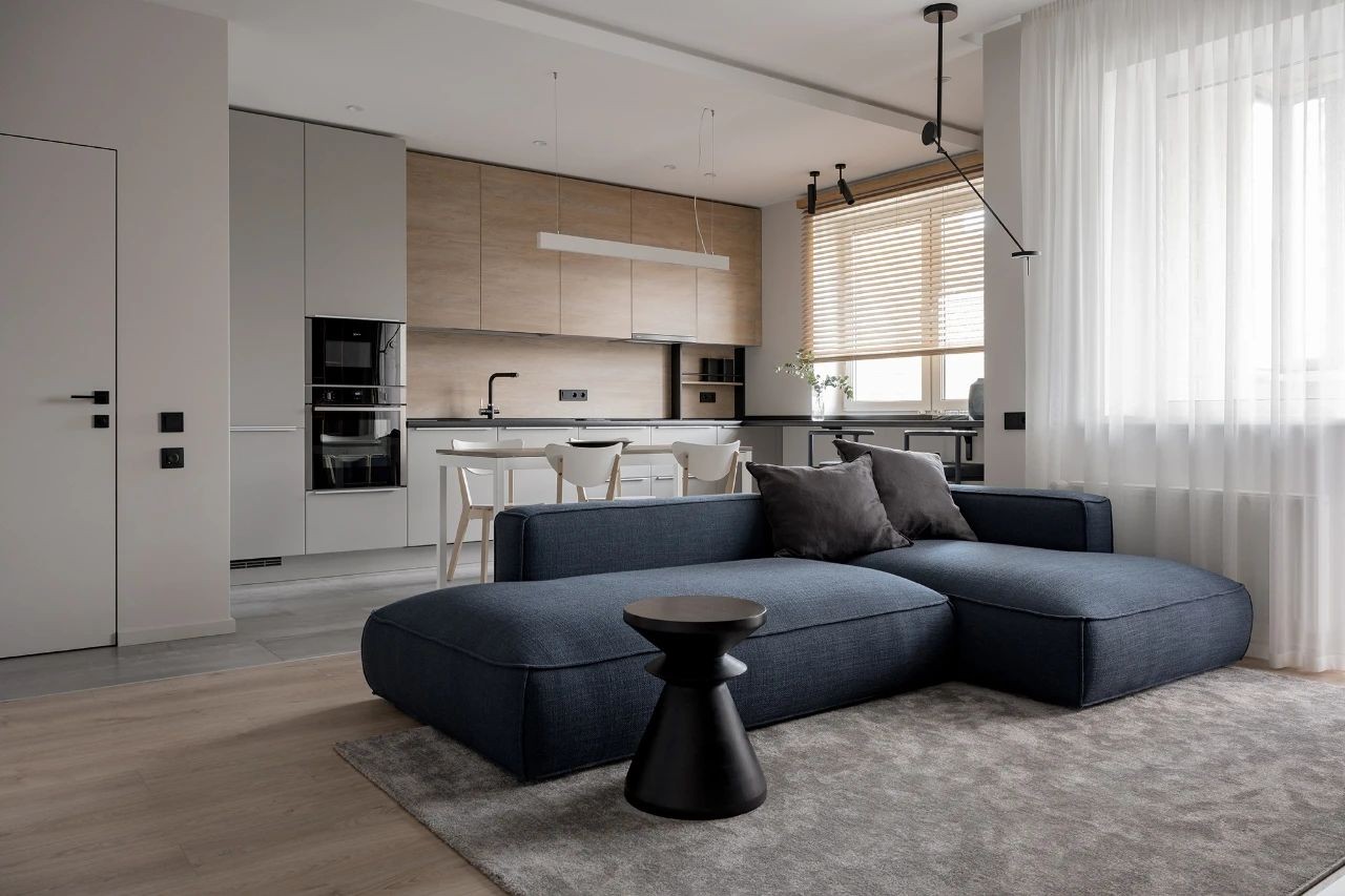 客厅中,设计师选用黑白灰搭配原木色作为空间的主色调,营造出经典的空间氛围。蓝灰色的布艺沙发搭配上造型富有设计感的黑色小茶几,为屋主打造出了一个舒适的社交空间。沙发旁的窗户保证了客厅中拥有充足的光线,给人明亮的视觉感受。黑色的电视墙旁有一个红色的置物架,为这片低饱和空间增添了一抹鲜艳的色彩。