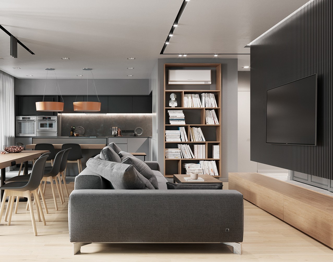 客厅以黑白灰三色交织在一起。电视背景墙以纯黑竖纹设计,打造出一种低调的奢华感。沙发以灰色为主,搭配同色系地毯,茶几以简约的木纹设计,整体错落有致,大小适宜。右侧做了大格子木质书架,方便阅读。无主灯设计,显得空间视觉更好~