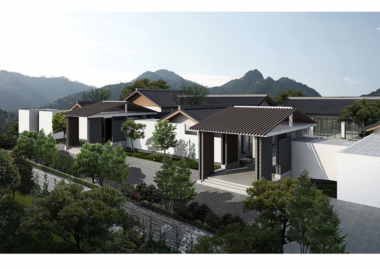 建筑设计为新中式风格,借助地势依山而建。