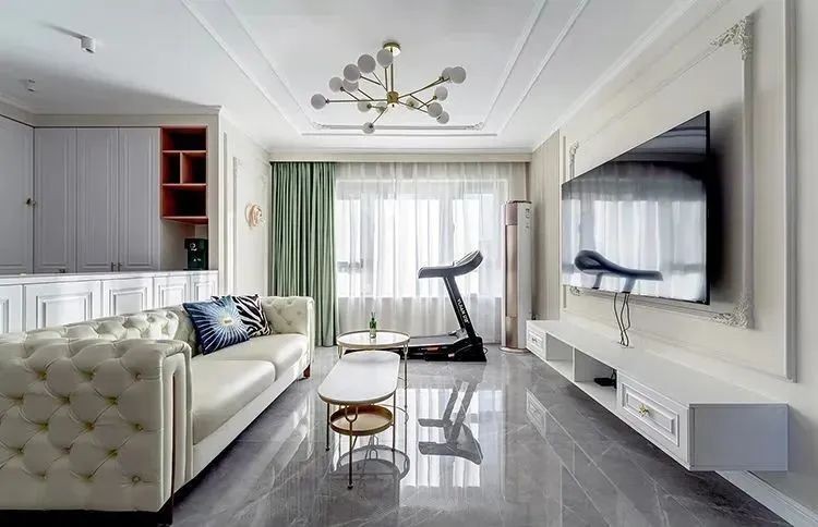 电视墙回字形的pu装饰线,统一为60cm宽。高低错落的精致线条,将墙面质感直接拉满,让空间更有层次