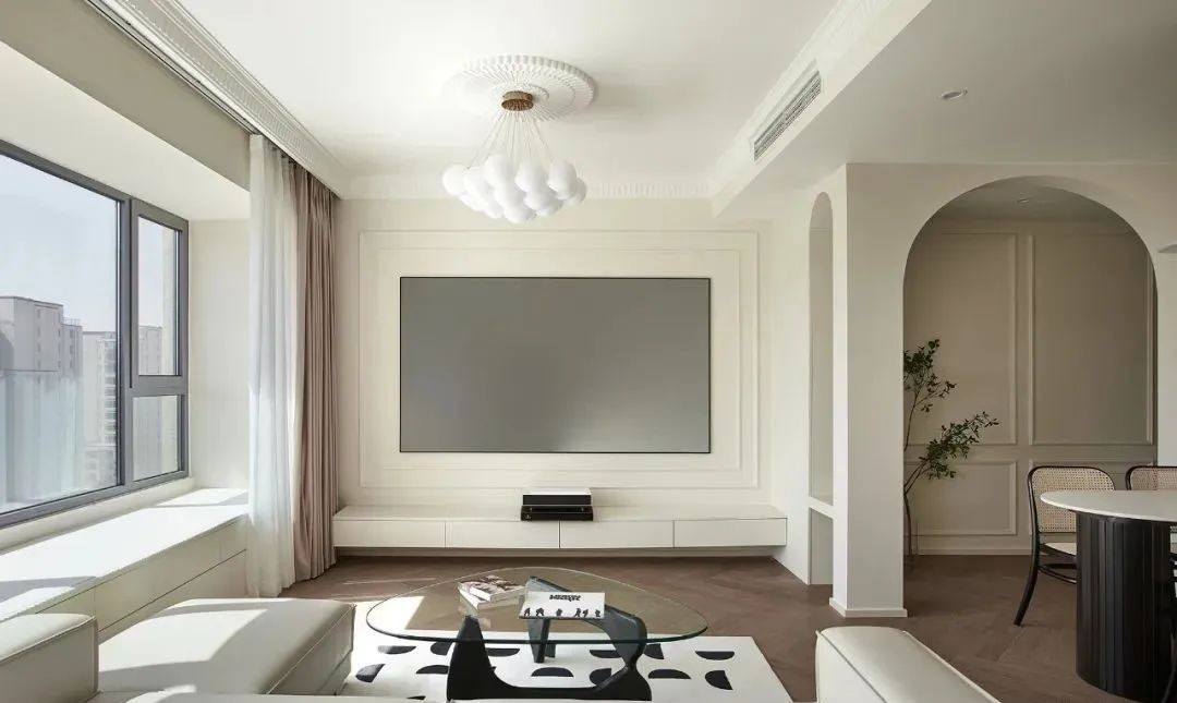 电视墙采用双层石膏线进行勾勒,搭配气球造型的吊灯+古典造型的石膏灯盘,现代与复古的冲撞,质感满满~