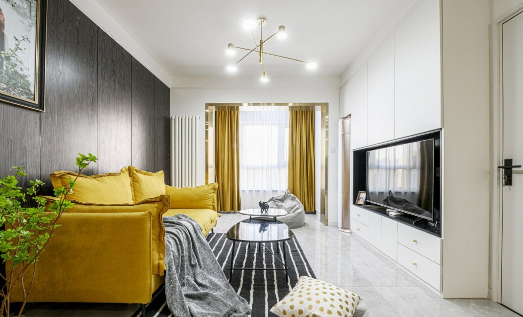 墙的顶面,做了双层石膏板,链接护墙板,这样墙面有层次感。深色木纹理护墙板和黄色布艺沙发,色彩和材质质地的对比